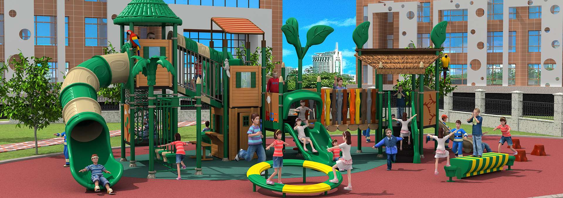 組合滑梯設(shè)計巧妙、色彩搭配和諧,塑料的各個部件的巧妙結(jié)合,兒童游樂設(shè)備給孩子帶來安全、歡樂和活潑的感受。